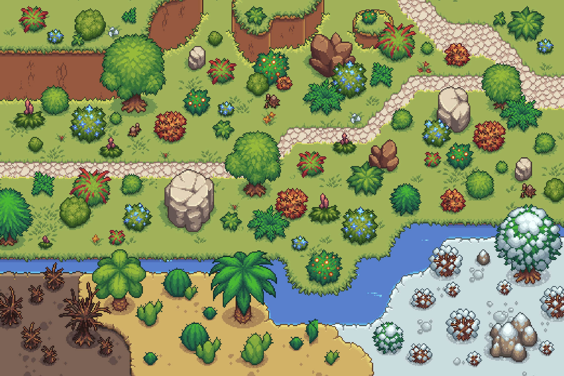 Here are Free Top-Down Bushes Pixel Art. You will clearly emphasize some goodies for yourself. It can be very useful for game developers who want to create various game genres, such as adventure, story quest, RPG, survival, and runner games. The set includes different types of bushes such as large and small bushes, withered bushes, snow-covered bushes, cacti, ferns, and bushes with various types of berries. This package provides a great opportunity to create a world full of colorful vegetation and exciting adventures. Moreover, these bushes can be used as in-game decorative items to make levels look more attractive.