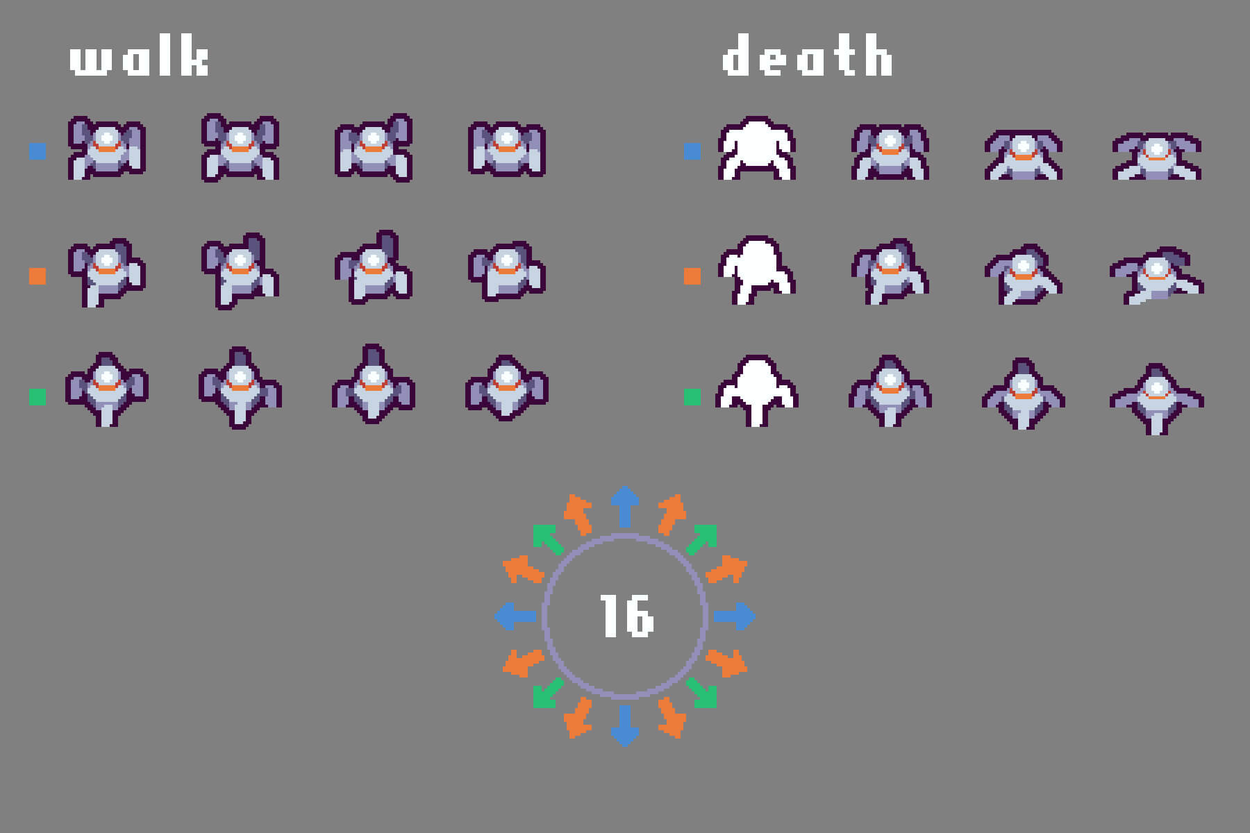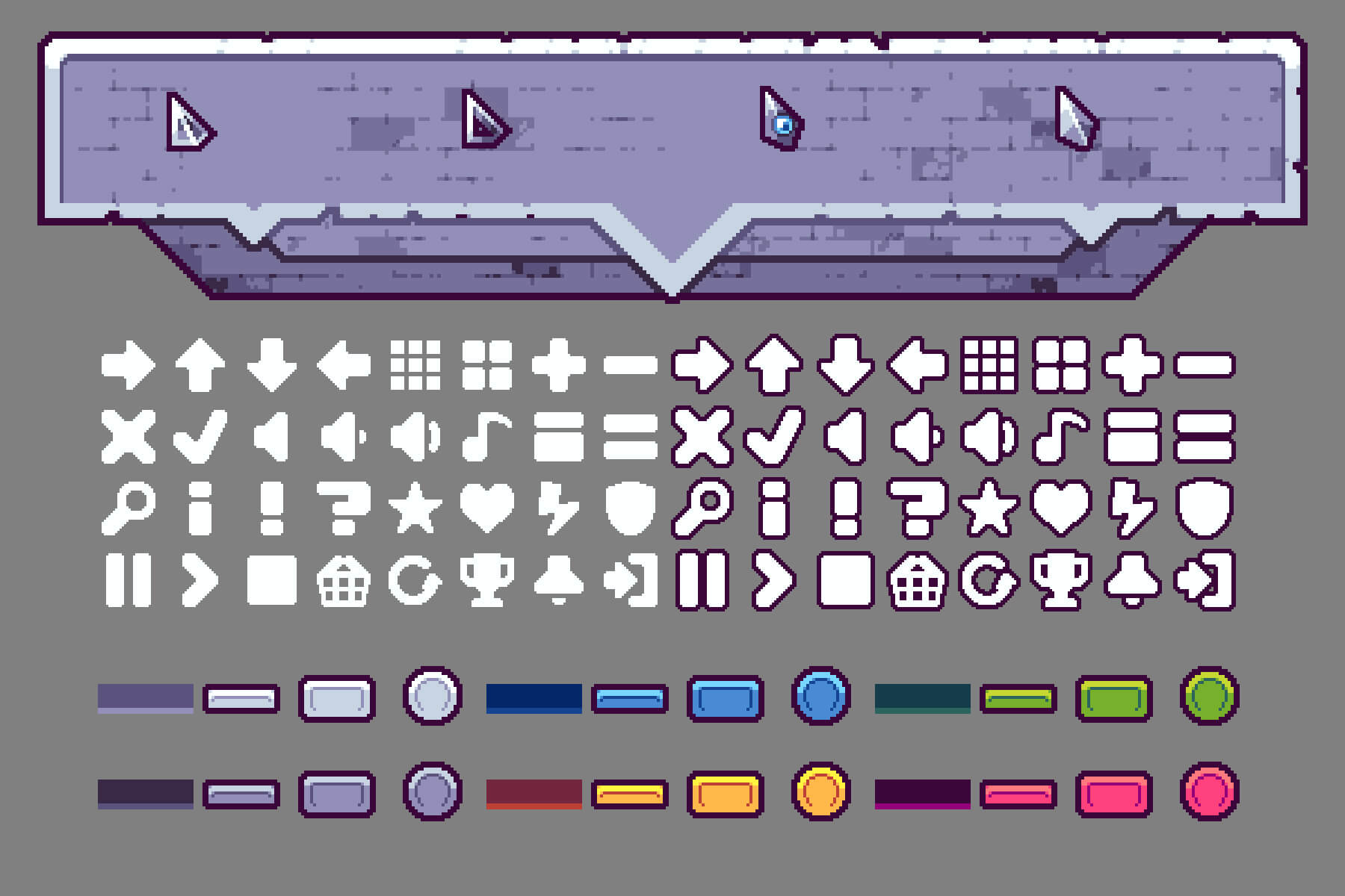 Enter a world of ruthless action and exciting adventures with the Free Roguelike Shoot ’em up Pixel Art Game Kit. This comprehensive set is a major asset for developers looking to create intense, dynamic worlds with roguelike elements. Filled with carefully crafted pixel art, this collection is designed to bring energy, style and endless interest to your game project. Among its repository, any 2D game developer will be able to find many popular and high-quality goodies. These include buttons for the game menu, such as arrows, music icons, awards, store buttons, and even references. They differ in shape and color, helping you add variety to your game. Also stored here are level tiles that will help recreate an interesting world. Many animated objects are available, including portals, reward stands, and save points. The level decorations, such as grass and rocks, add a deserted and abandoned feel, while the variety of weapons, like shields, large-caliber guns, and machine guns with three barrels, along with their icons, provide players with a worthy selection. And the character in the form of a steel spider robot, and the possibilities of versatile movement on the map, gives you a special choice for its use.