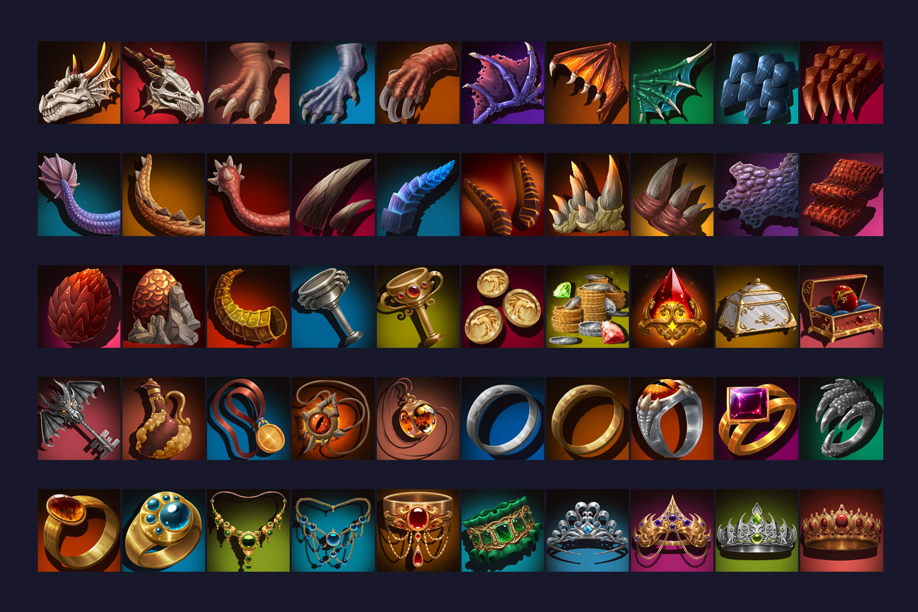 Free RPG Dragon Loot Icons are not only a wonderful set of high-quality icons but also offer a huge variety. They allow you to effectively diversify your gameplay and the entire game world as a whole. 50 icons are stored here, each of which is prepared in the popular resolution 512×512. As such, this collection of icons will add a touch of fantasy and excitement to your game by depicting the treasures and artifacts that players can obtain through epic encounters with dragons or other creatures.