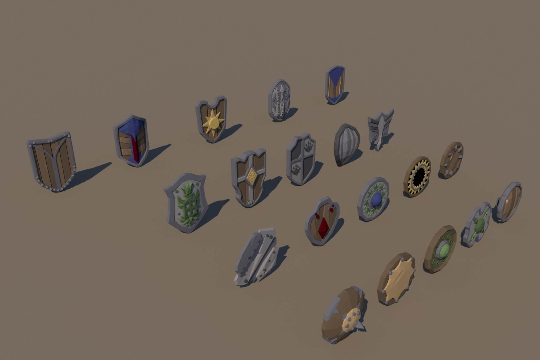 Before you Free Shield 3D Low Poly Models. The set consists of shields of different sizes and shapes. There are 20 objects in total. They are suitable for any races and classes of characters. Each item has a unique appearance and decorative materials. They are made from wood, metal, stone and other resources.