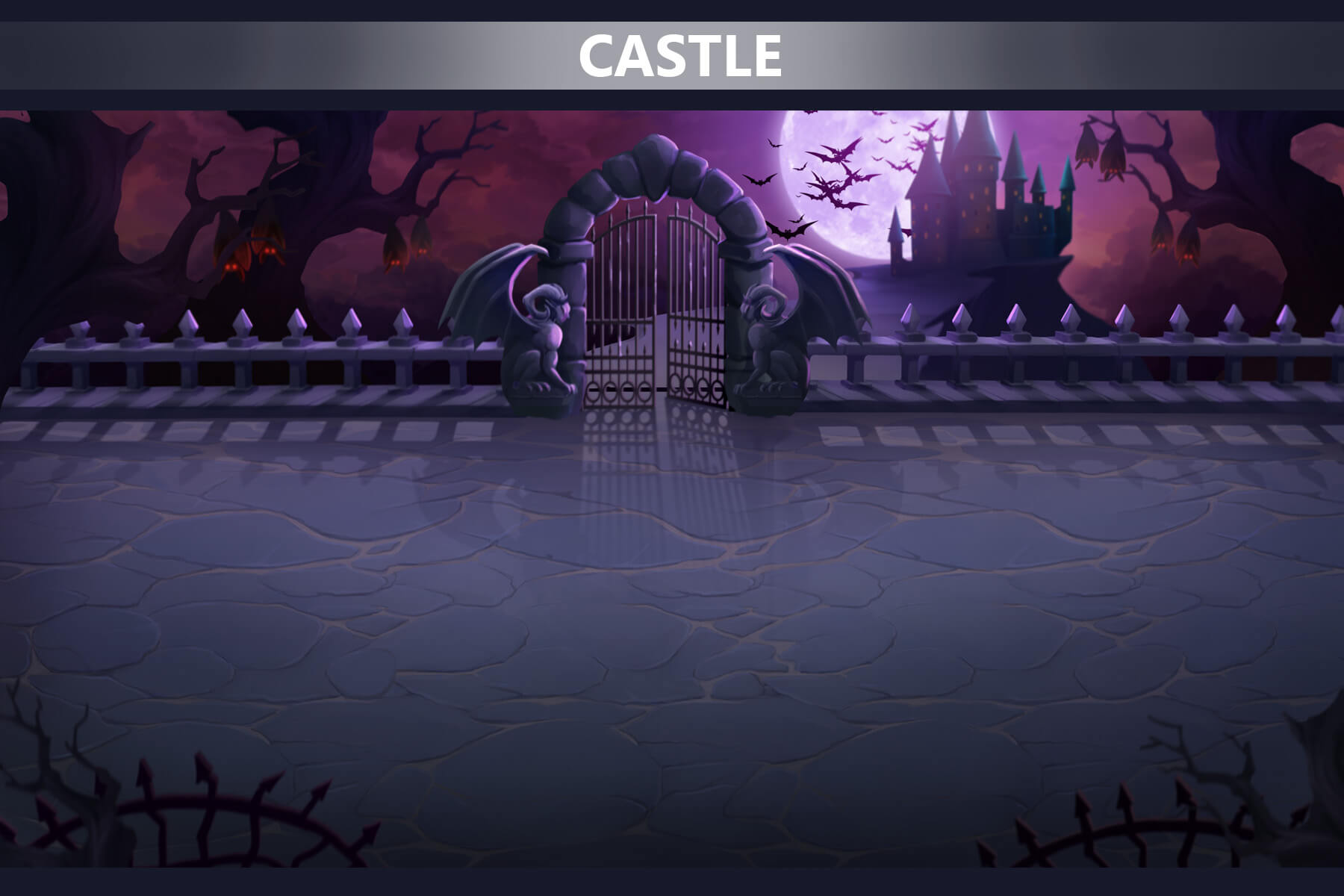• Castle: A foreboding fortress hidden behind a moonlit fence, surrounded by flocks of bats perched on ancient branches. Gargoyle statues guard the entrance, while a stone path resembling a coffin lid adds an extra layer of dread.