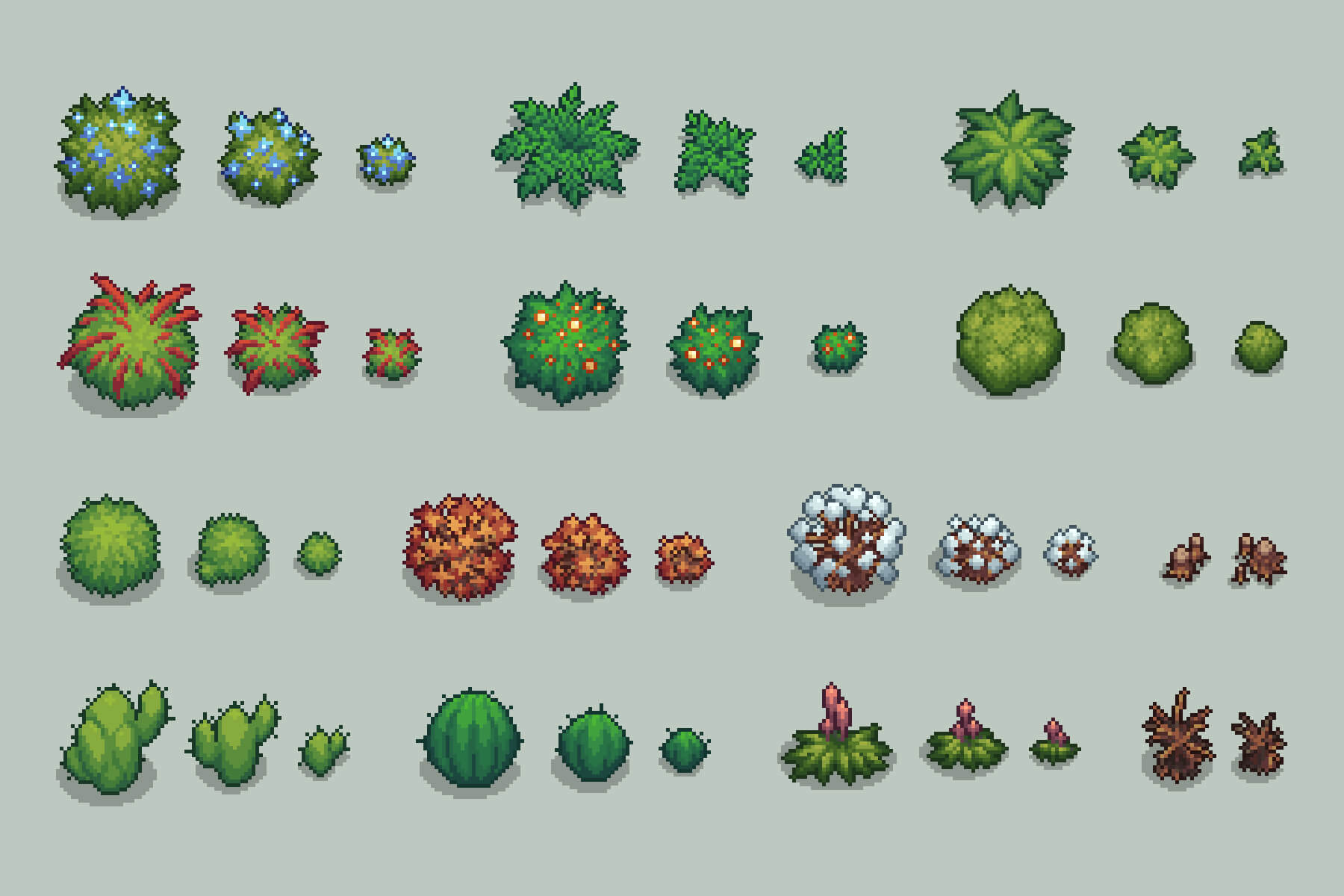 Here are Free Top-Down Bushes Pixel Art. You will clearly emphasize some goodies for yourself. It can be very useful for game developers who want to create various game genres, such as adventure, story quest, RPG, survival, and runner games. The set includes different types of bushes such as large and small bushes, withered bushes, snow-covered bushes, cacti, ferns, and bushes with various types of berries. This package provides a great opportunity to create a world full of colorful vegetation and exciting adventures. Moreover, these bushes can be used as in-game decorative items to make levels look more attractive.