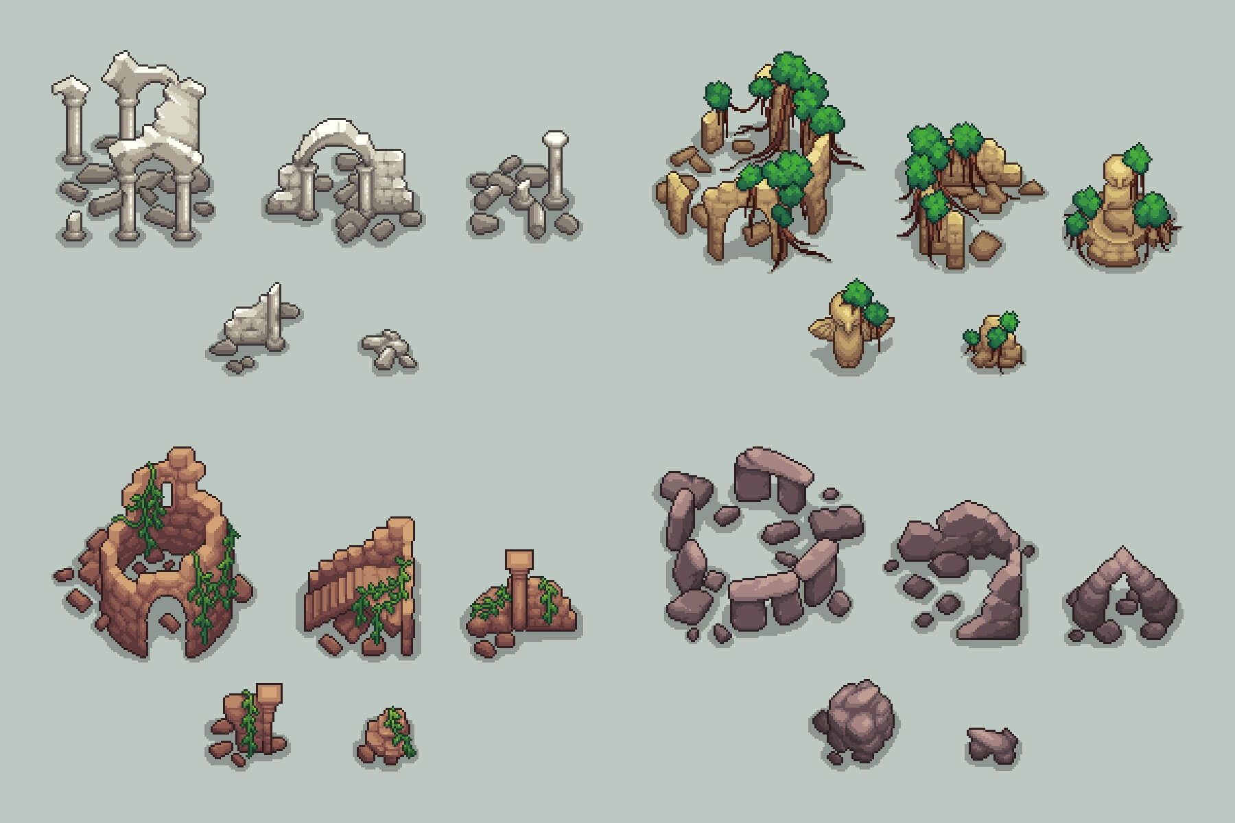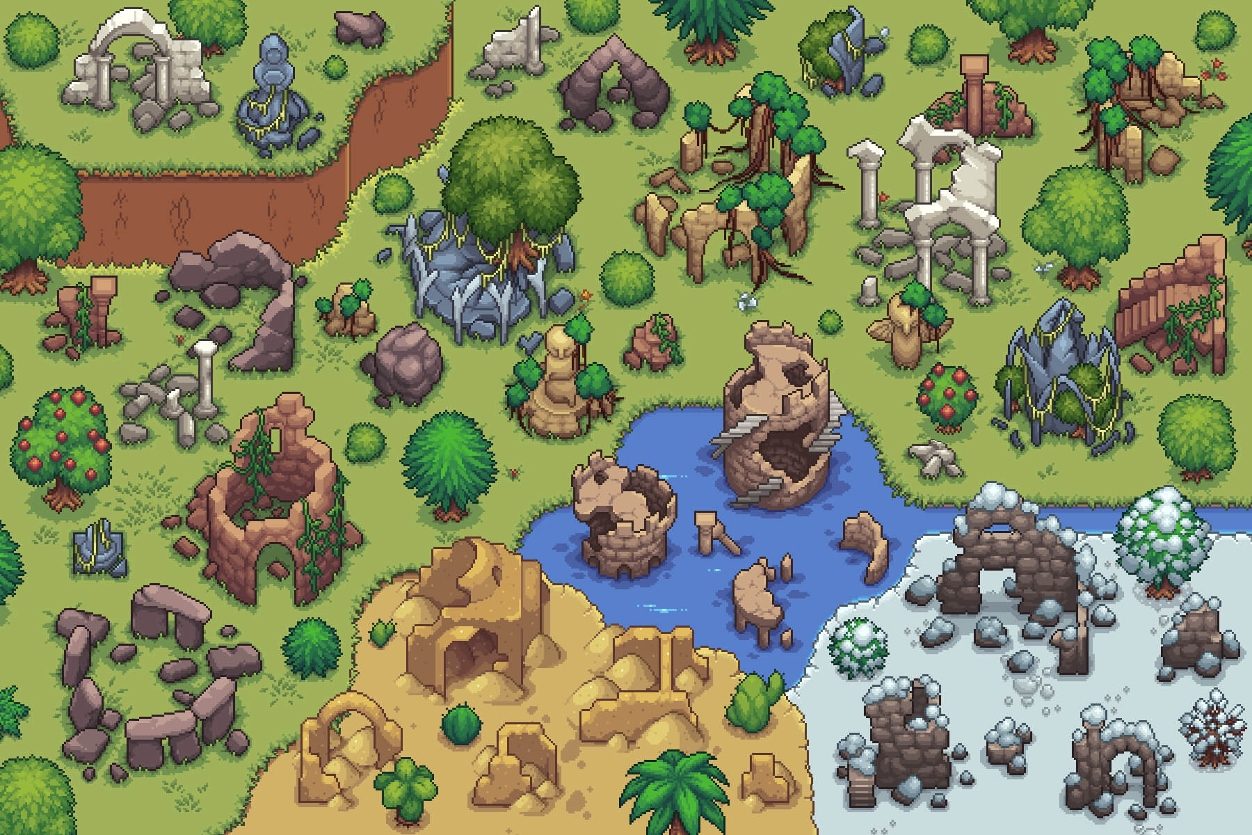 Use this pack to create a huge, sprawling world filled with ancient ruins to explore, find new artifacts, and fight bosses. In addition, you can easily modify the entire structure of the set at any time. For example, resize, make trees or ruins more saturated with bright colors, or leave everything in the original. Due to the use of pixel art here, this set is best edited in any graphics editor, such as Adobe Photoshop.