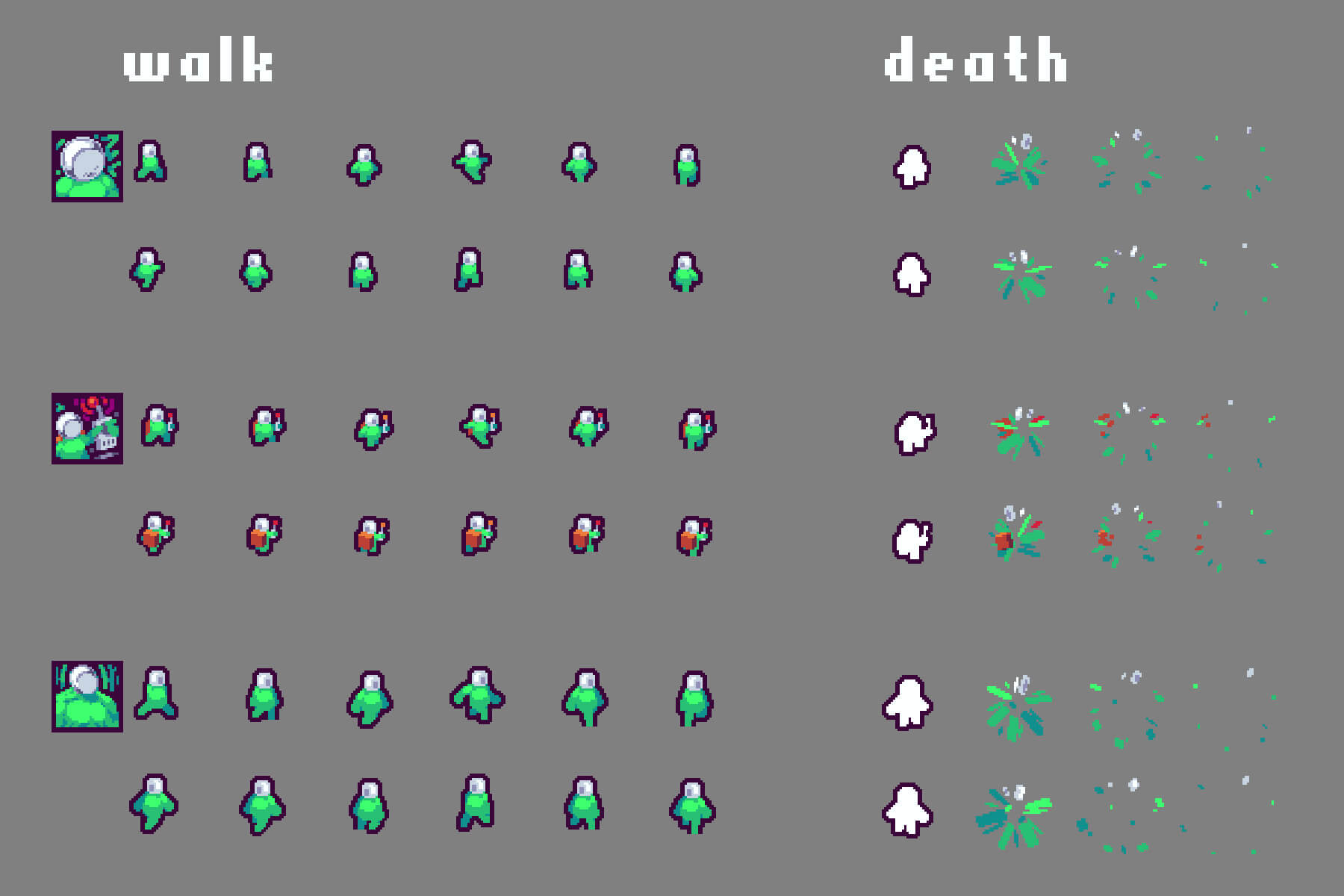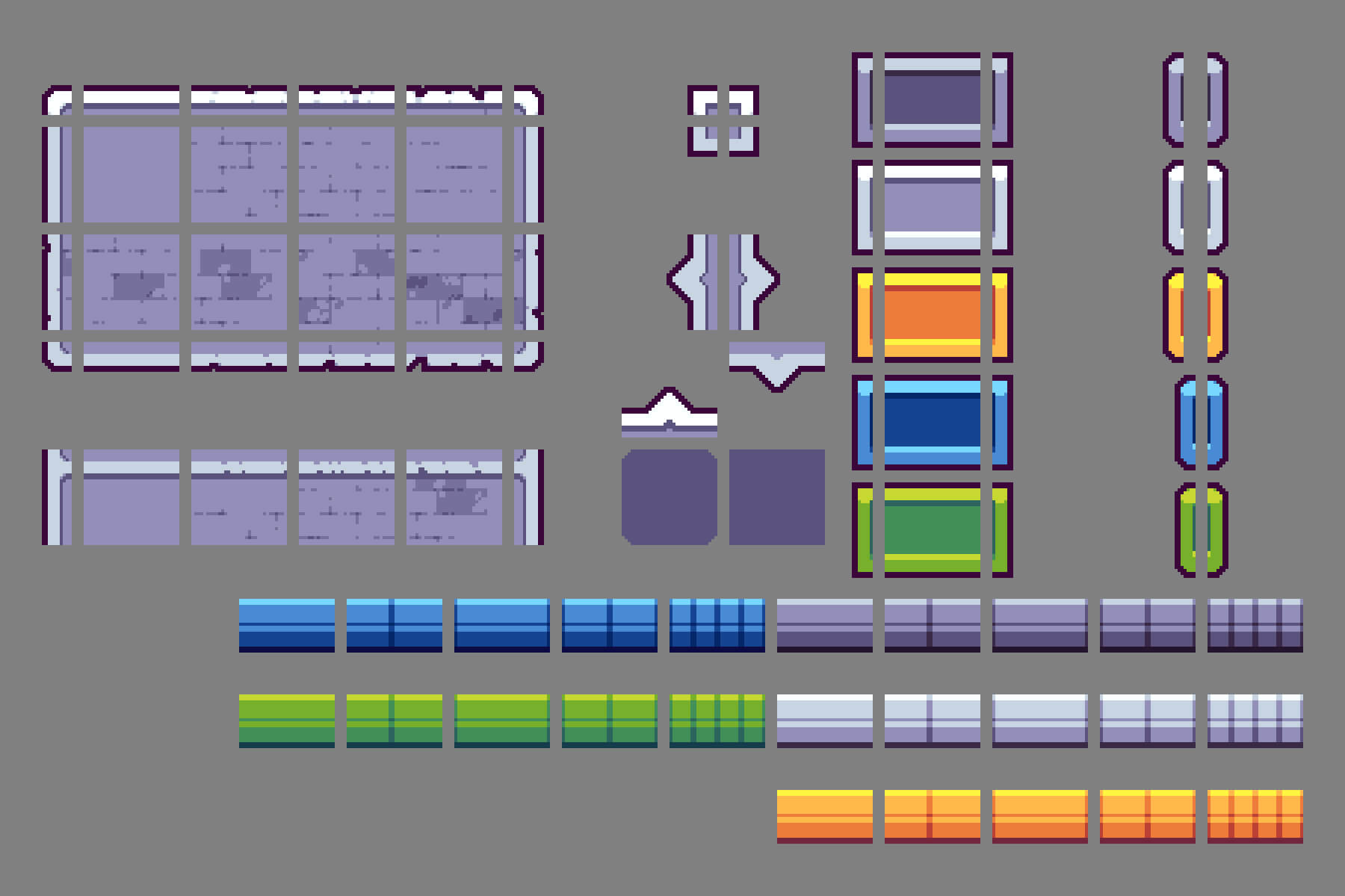 Enter a world of ruthless action and exciting adventures with the Free Roguelike Shoot ’em up Pixel Art Game Kit. This comprehensive set is a major asset for developers looking to create intense, dynamic worlds with roguelike elements. Filled with carefully crafted pixel art, this collection is designed to bring energy, style and endless interest to your game project. Among its repository, any 2D game developer will be able to find many popular and high-quality goodies. These include buttons for the game menu, such as arrows, music icons, awards, store buttons, and even references. They differ in shape and color, helping you add variety to your game. Also stored here are level tiles that will help recreate an interesting world. Many animated objects are available, including portals, reward stands, and save points. The level decorations, such as grass and rocks, add a deserted and abandoned feel, while the variety of weapons, like shields, large-caliber guns, and machine guns with three barrels, along with their icons, provide players with a worthy selection. And the character in the form of a steel spider robot, and the possibilities of versatile movement on the map, gives you a special choice for its use.