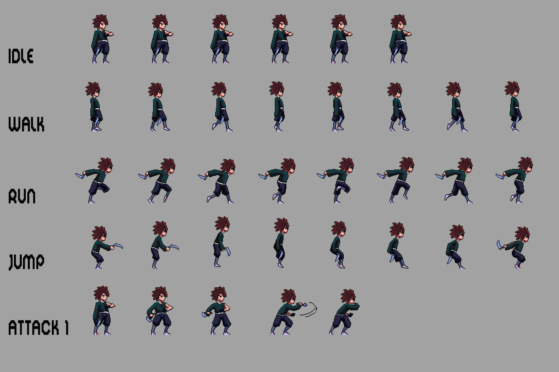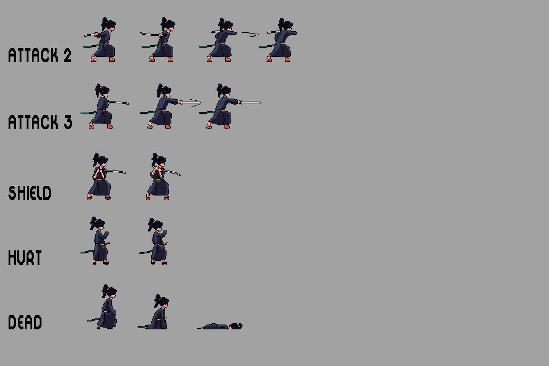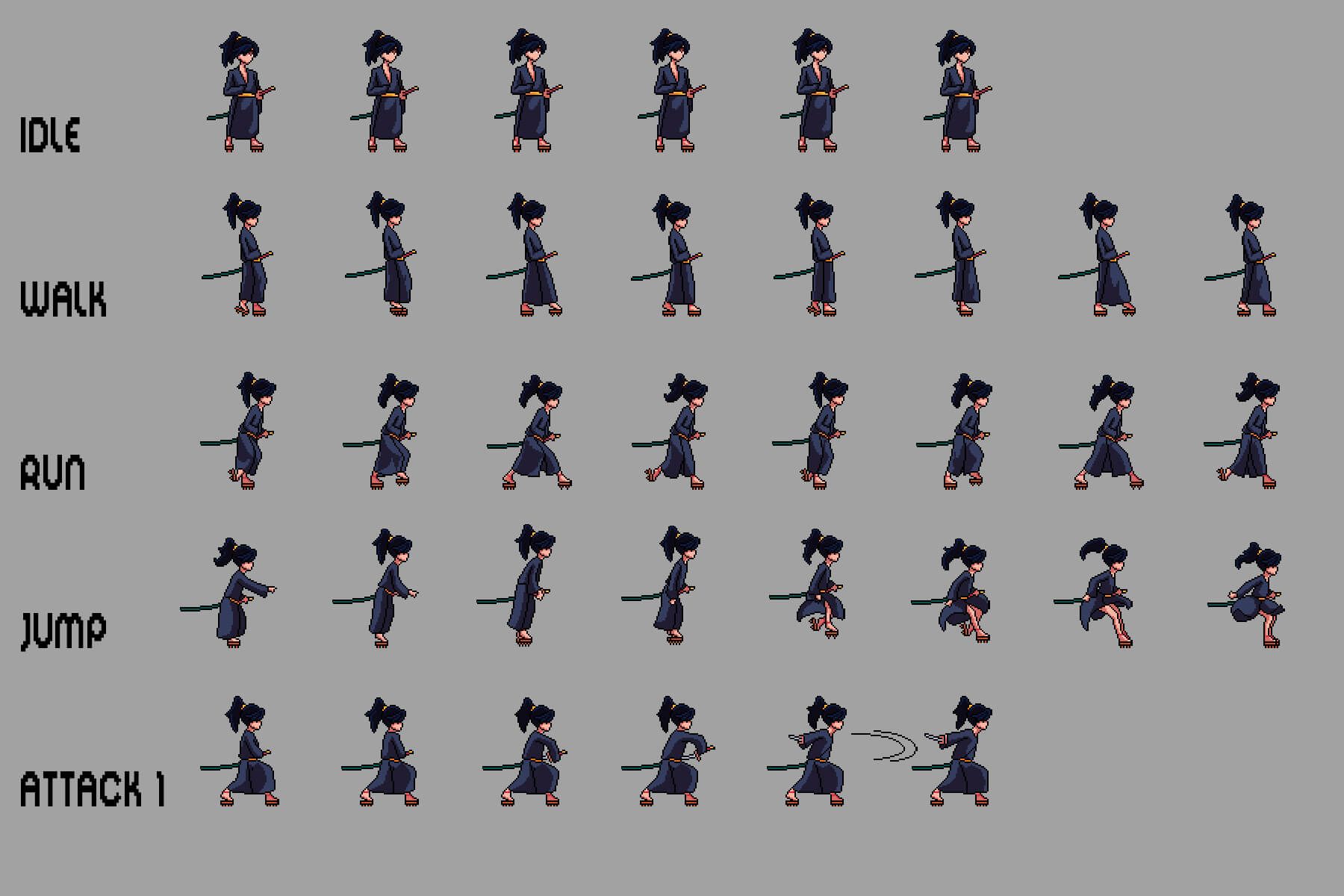One of the main advantages of this set is that each character found here has its own set of unique movement animations. Idle, walk, run, jump, several types of attacks and other useful animations that will make your game project more interactive and complete. Use it to create a world with enough room for the sneak attacks of the shinobi, the daring breakthrough of the samurai and the lightning attacks of the fighter. In addition, if you need to edit the appearance of these characters, you can use any editor that allows you to work with graphics formats such as PSD, PNG, for example Adobe Photoshop.