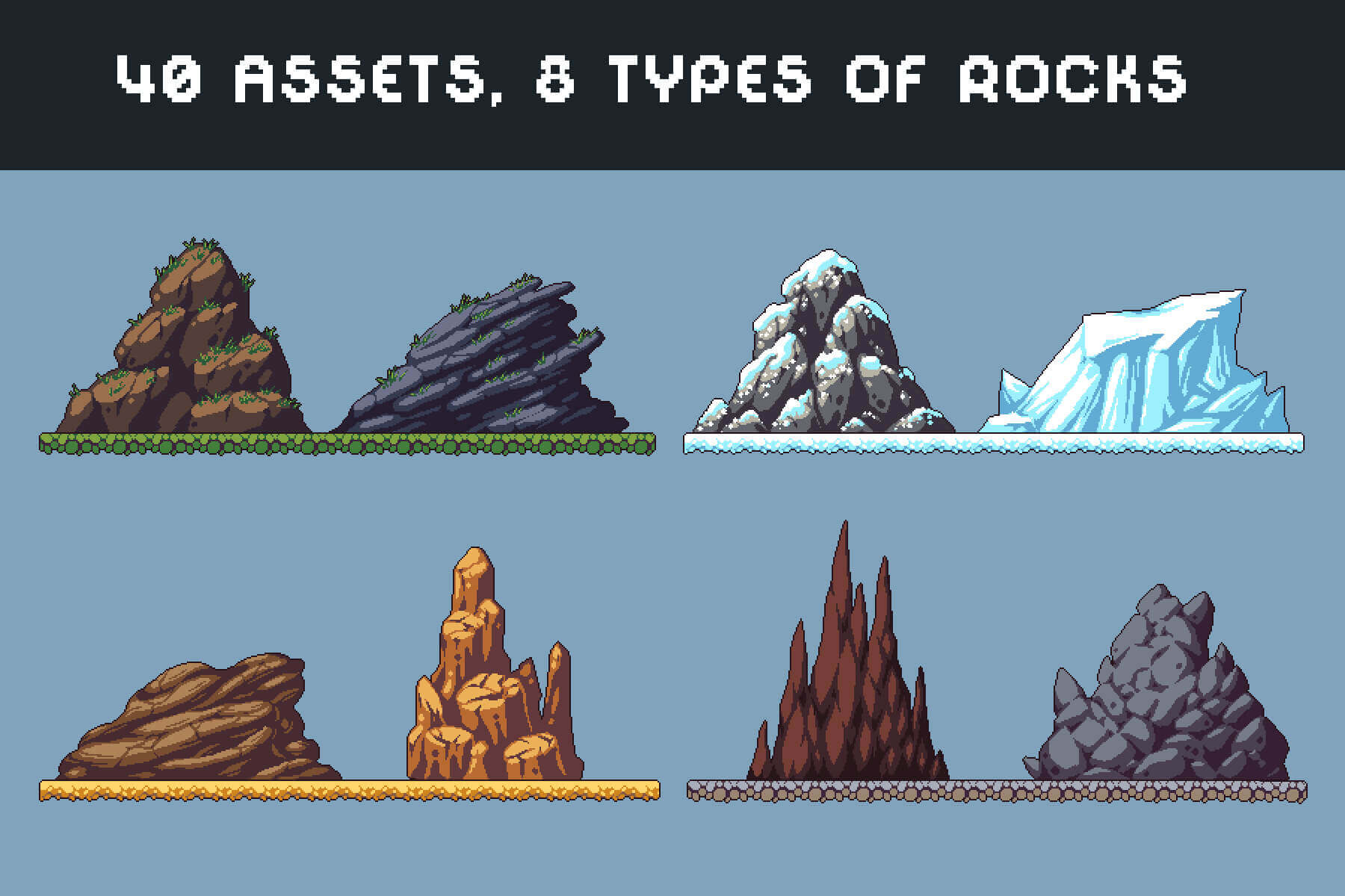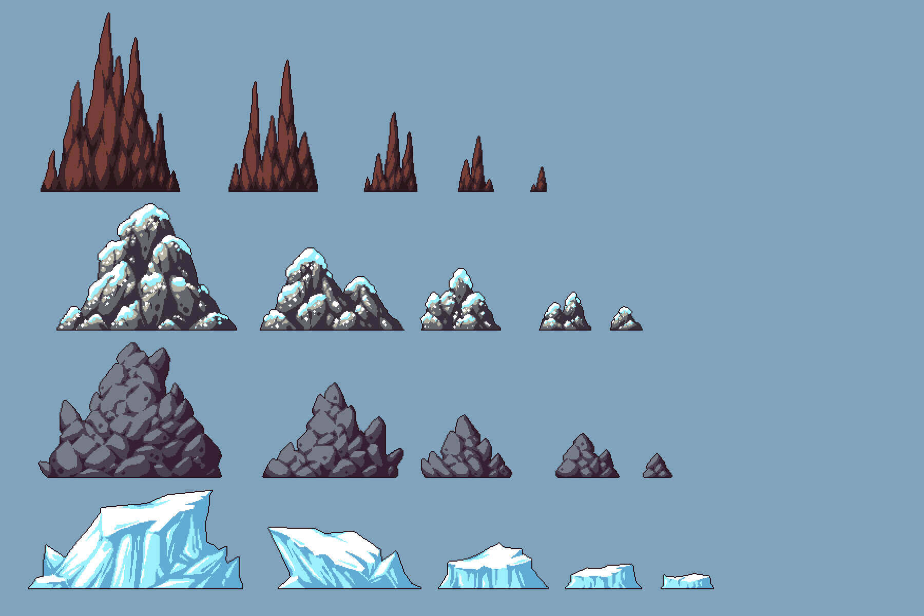 Introducing the Free Rocks Pixel Art Asset Pack, ready to use in your 2D game projects. This set will be useful for creating various background landscapes. And also you can use it in many genres (RPGs, platformers, adventures, quests, turn-based, runners, strategies, etc.). The archive contains 8 types of mountains that can be used in different biomes (covered with snow, mountains from the desert, overgrown with grass, etc.).