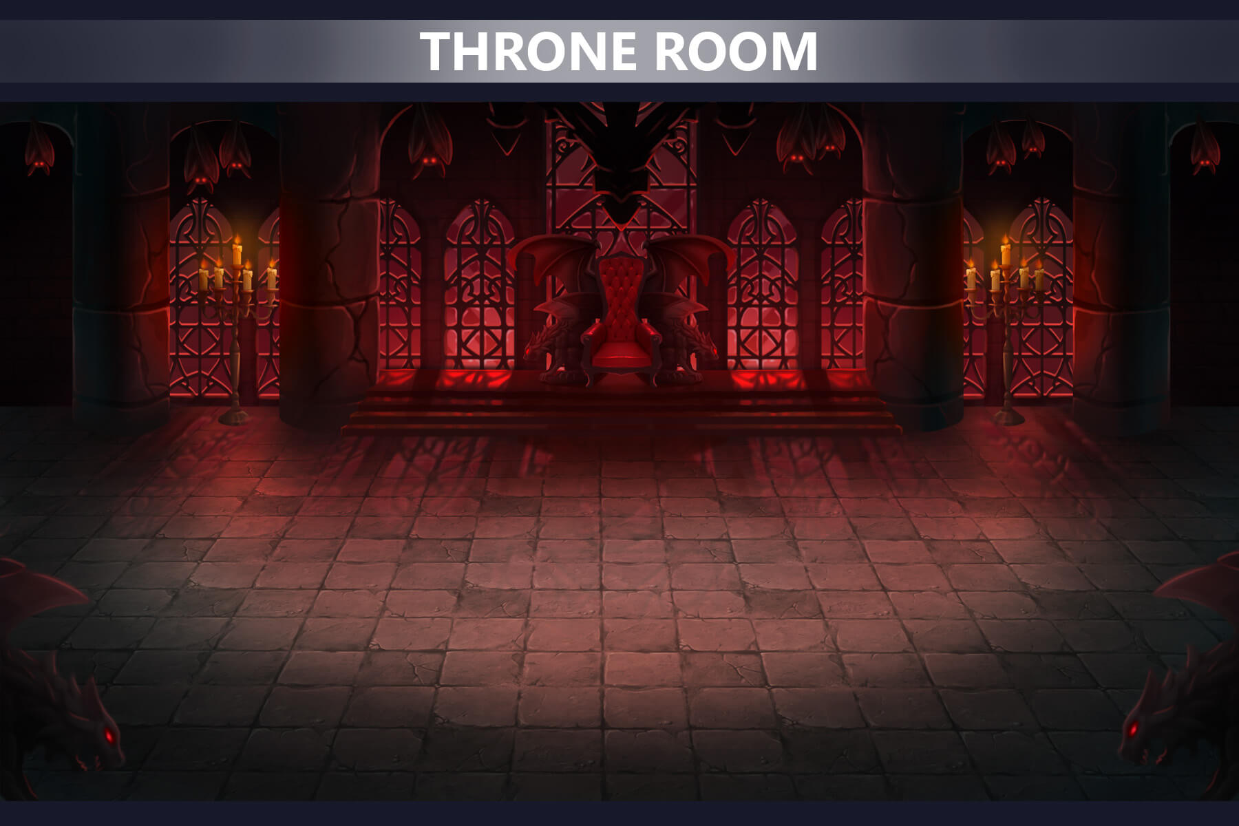 • Throne Room: A site pulsing with dark energy, illuminated by vivid crimson light. The stone walls and floors, paired with a winged throne, set the stage for an epic showdown, leaving players with no choice but to fight for survival.